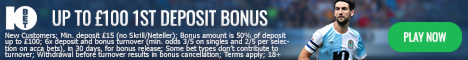 * New Customers; Min. deposit £15 (no Skrill/Neteller); Bonus amount is 50% of deposit up to £100; 6x deposit and bonus turnover (min. odds 3/5 on singles and 2/5 per selection on acca bets), in 30 days, for bonus release; Some bet types don’t contribute to turnover; Withdrawal before turnover results in bonus cancellation; Terms apply; 18+.